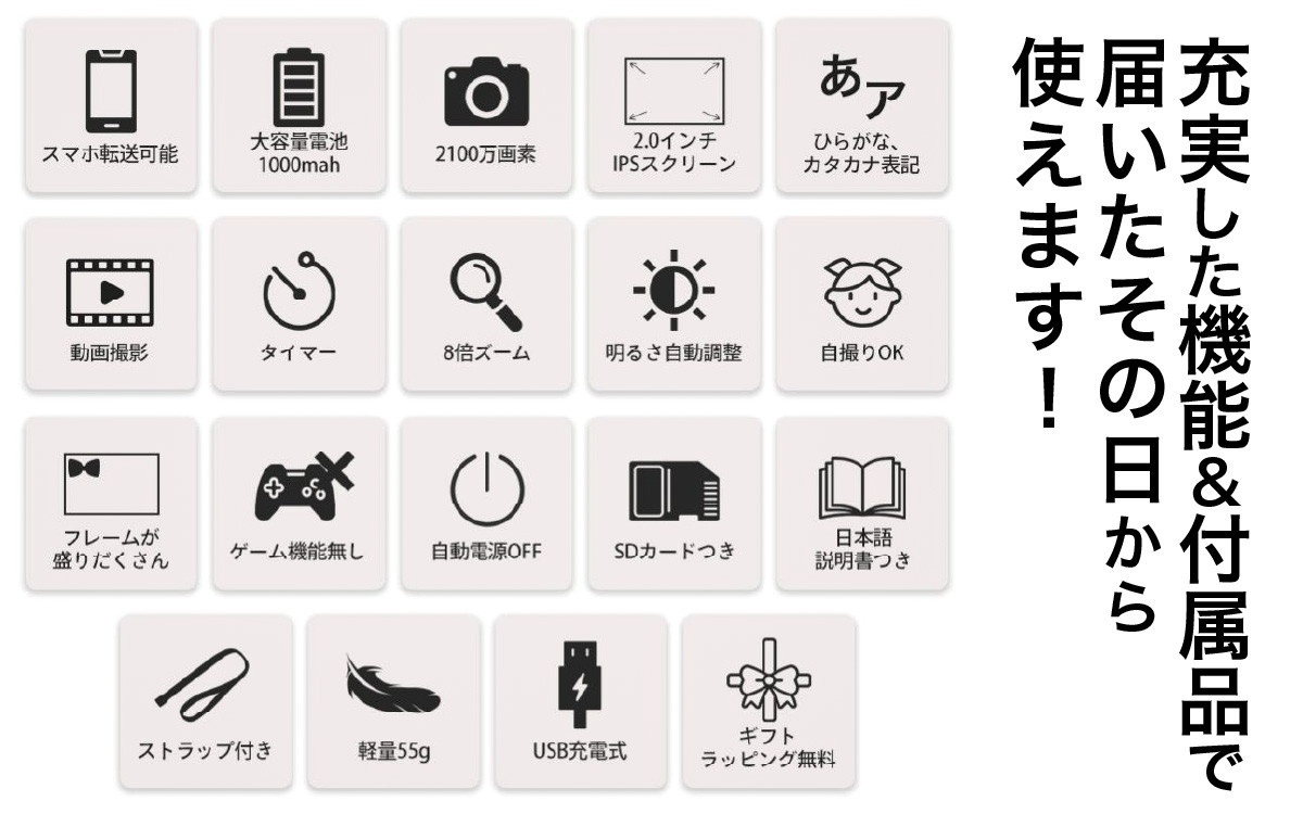 検索キーワード:キッズカメラ MiNiPiC® ミニピク トイカメラ スマホ転送可能 SDカード 付き 使い方がわかりやすい 日本語説明書 誕生日プレゼント 知育玩具 キャンプ アウトドア バーベキュー フェス
