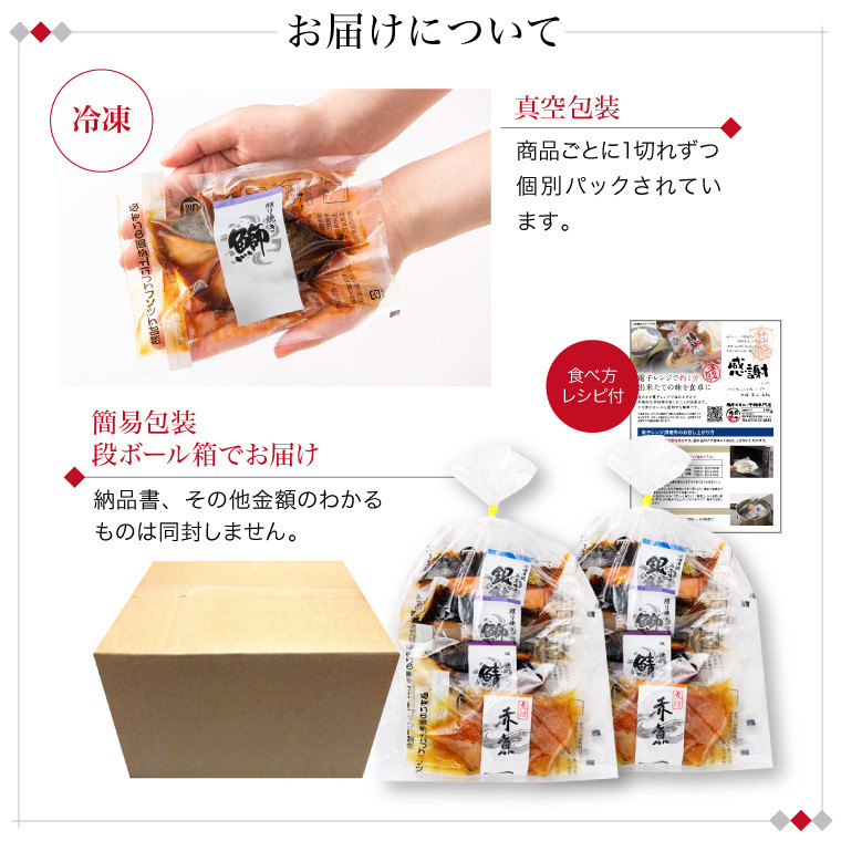 | 容量 | 1回のお届け内容:切数4種8切 ・さば塩焼×2切 ・銀鮭西京焼×2切 ・ぶり照り焼×2切 ・赤魚煮付×2切 ※漁の関係上、魚種が変更になる場合があります ※骨取りは手作業のため、ごくまれに小骨が残っている場合がありますのでご注意ください |