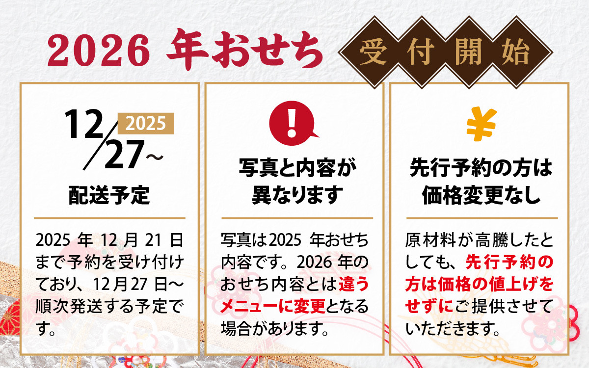 2025年12月27日から順次発送予定 注意事項・その他【必ずお読みください】 ※12月27日から順次発送予定です。 ※天候・交通事情等により年内発送出来かねる場合もございます。 ※お節料理の内容は変更になる場合があります。 ※解凍後はなるべく早くお召し上がりください。 ※お受け取りいただけなかった場合の再送はいたしかねますので予めご了承ください。 ※寄附申込みのキャンセル、返礼品の変更・返品はできません。あらかじめご了承ください。 |