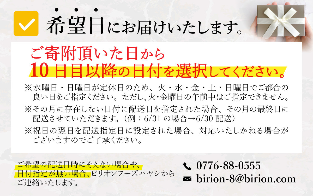 ※ご寄附いただいた日から10日目~2か月以内の配送希望日をご指定してください。