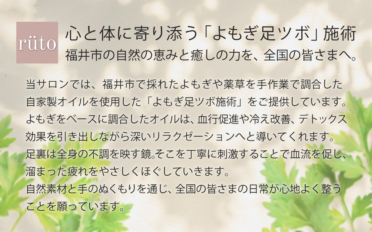 ルトでは、福井市で採れたよもぎや薬草、植物の力をぎゅっと詰め込んだ自家製オイルを使用した「よもぎ足ツボ施術」をご提供しています。
