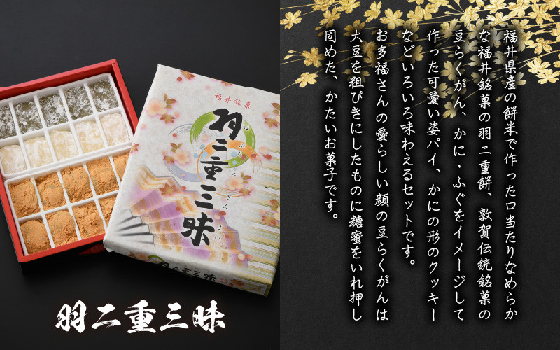 福井銘菓の羽二重餅やふぐパイ・かにパイ・かにの形のクッキー・敦賀伝統銘菓の豆らくがんのセットです。