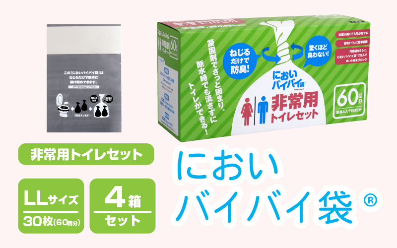特殊な新素材を使用した驚くほど臭わない強力防臭袋! [020-h001] においバイバイ袋 非常用トイレセット LLサイズ 30枚(60回分)× 4箱(計120枚)
