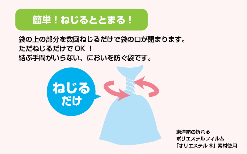 ぎゅっと結ぶ手間が要らずに簡単に、臭いを防ぐ袋です。