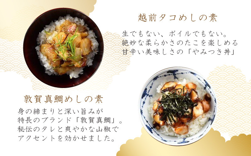 | 容量 | ■内容量 / 原産地 / 製造地 / 製造者 海鮮丼の素 全5種セット 【1】うお吟名物「恵びす丼の素」90g × 1袋 原産地:ハマチ(若狭湾) 【2】敦賀真鯛めしの素 90g × 1袋 原産地:マダイ(敦賀湾) 【3】越前タコめしの素 90g × 1袋 原産地:たこ(若狭湾) 【4】鯖とろめしの素 90g × 1袋 原産地:さば(若狭湾) 【5】開運イカいくらめしの素 90g × 1袋 原産地:いか(若狭湾) 製造地:すべて敦賀市 製造者:株式会社 味蕾 / うお吟 |