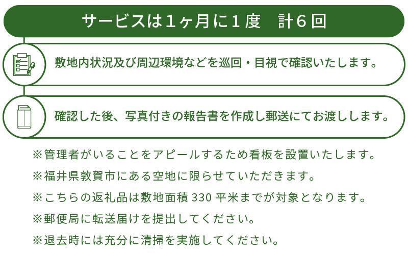 | 容量 | ■内容量 不動産事業者が行う空地管理 全6回 ※毎月1回、6ヶ月の全6回パックとなります。 < 作業内容 > 敷地内状況及び不法投棄の有無の確認、及び周辺環境など確認。 敷地内及び周辺環境を、写真を添付しご報告いたします。 ※管理者がいることをアピールするため、看板を設置いたします。 ※確認後、写真付き報告書を郵送いたします。 |