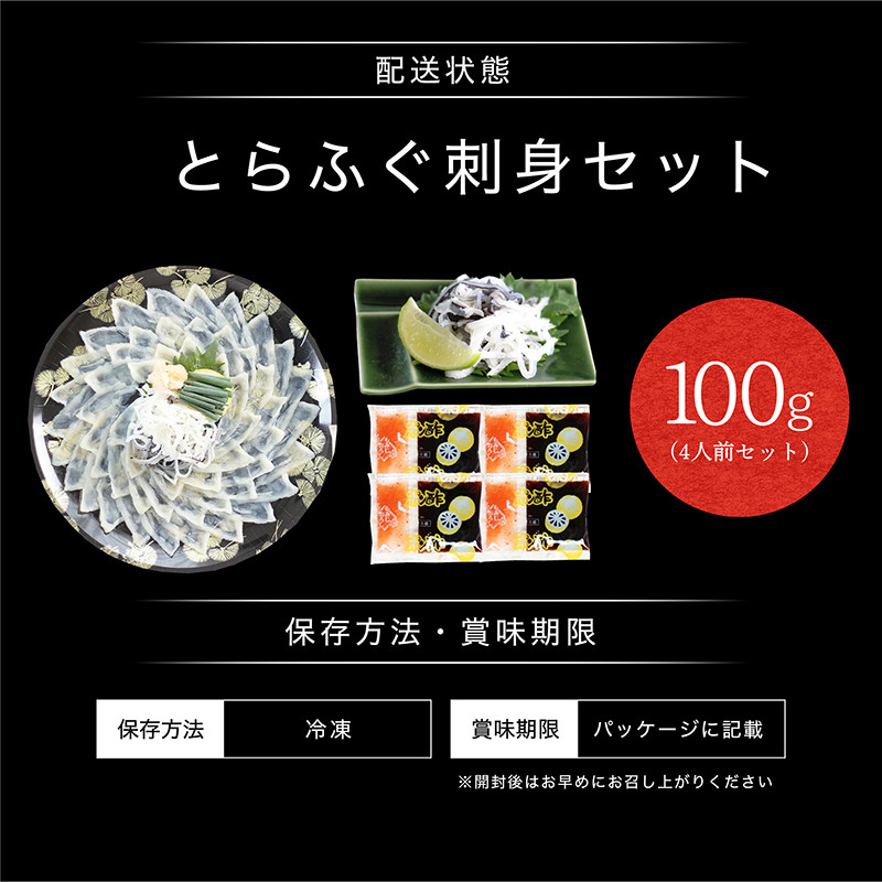 | 容量 | ・とらふぐ刺身(福井県敦賀市産)100g(3〜4人前) ・とらふぐ皮刺身 50g ・特製ポン酢 4袋 ・特製もみじおろし 4袋 |