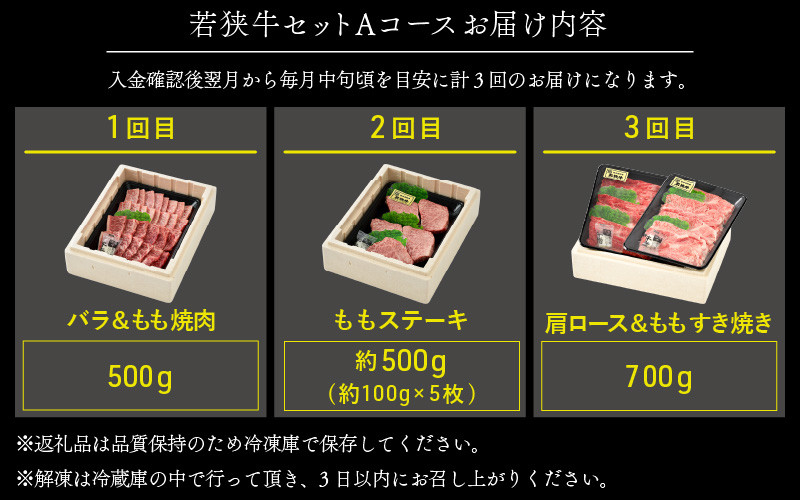 品質規格はとても厳しく、3等級以上の高品質な牛肉のみとされています。 定期便 ≪3ヶ月連続お届け≫ 若狭牛 セット Aコース 計約1.7kg【牛肉 肉 お肉 黒毛和牛 和牛 ブランド牛 詰め合わせ 冷凍 お中元 お歳暮 ギフト 贈り物 プレゼント】[051-h001]