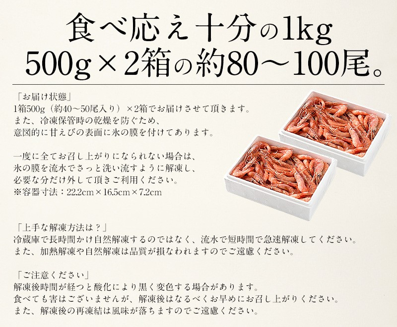 | 容量 | ■内容量 福井県敦賀産甘えび・子なし小サイズ500g × 2箱(正式名称:ホッコクアカエビ) |