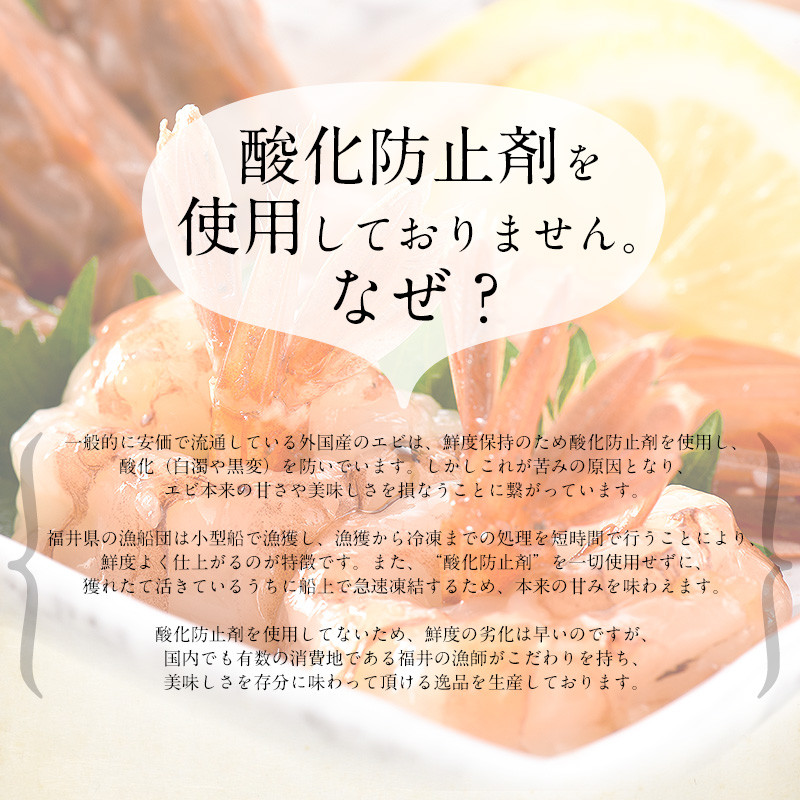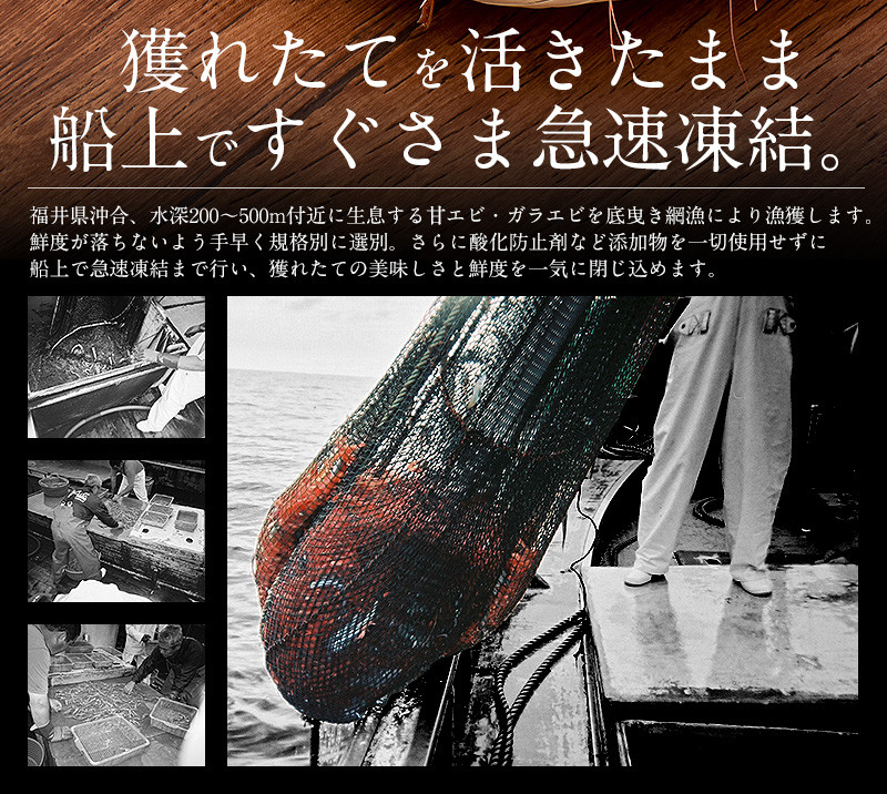 福井県を代表する海の幸のひとつに甘エビがありますが、6月~7月・10月~11月にかけ底引き網漁の盛漁期を迎え、日本海沿岸でも特に好漁場とされるポイントにて漁獲し、すぐさま船内で急速凍結されます。