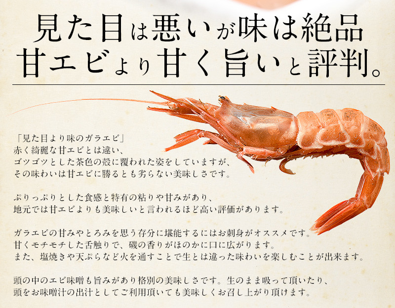 赤く綺麗な甘エビとは違い、ゴツゴツとした茶色の殻に覆われた姿をしていますが、その味わいは甘エビに勝るとも劣らない美味しさです。ぷりっぷりとした食感と特有の粘りや甘みがあり、地元では甘エビよりも美味しいと言われるほど高い評価があります。地元の飲食店でも滅多にお目にかかることが出来ないエビとなっております。