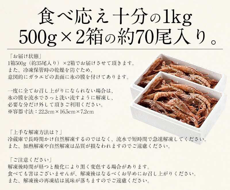 | 容量 | ■内容量 福井県敦賀産ガラエビ500g × 2箱(正式名称:トゲザコエビ) |