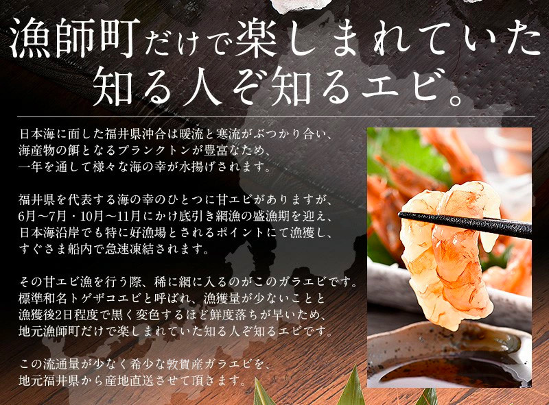 頭の中のエビ味噌も旨みがあり格別の美味しさです。生のまま吸って頂いたり、お刺身で残った頭をお味噌汁の出汁としてご利用頂いても美味しくお召し上がり頂けます。この流通量が少ない敦賀産ガラエビを、地元福井県から産地直送させて頂きます。