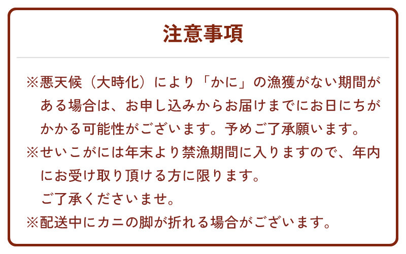 ※悪天候(大時化)により「かに」の漁獲がない期間がある場合は、お申し込みからお届けまでにお日にちがかかる可能性がございます。予めご了承願います。