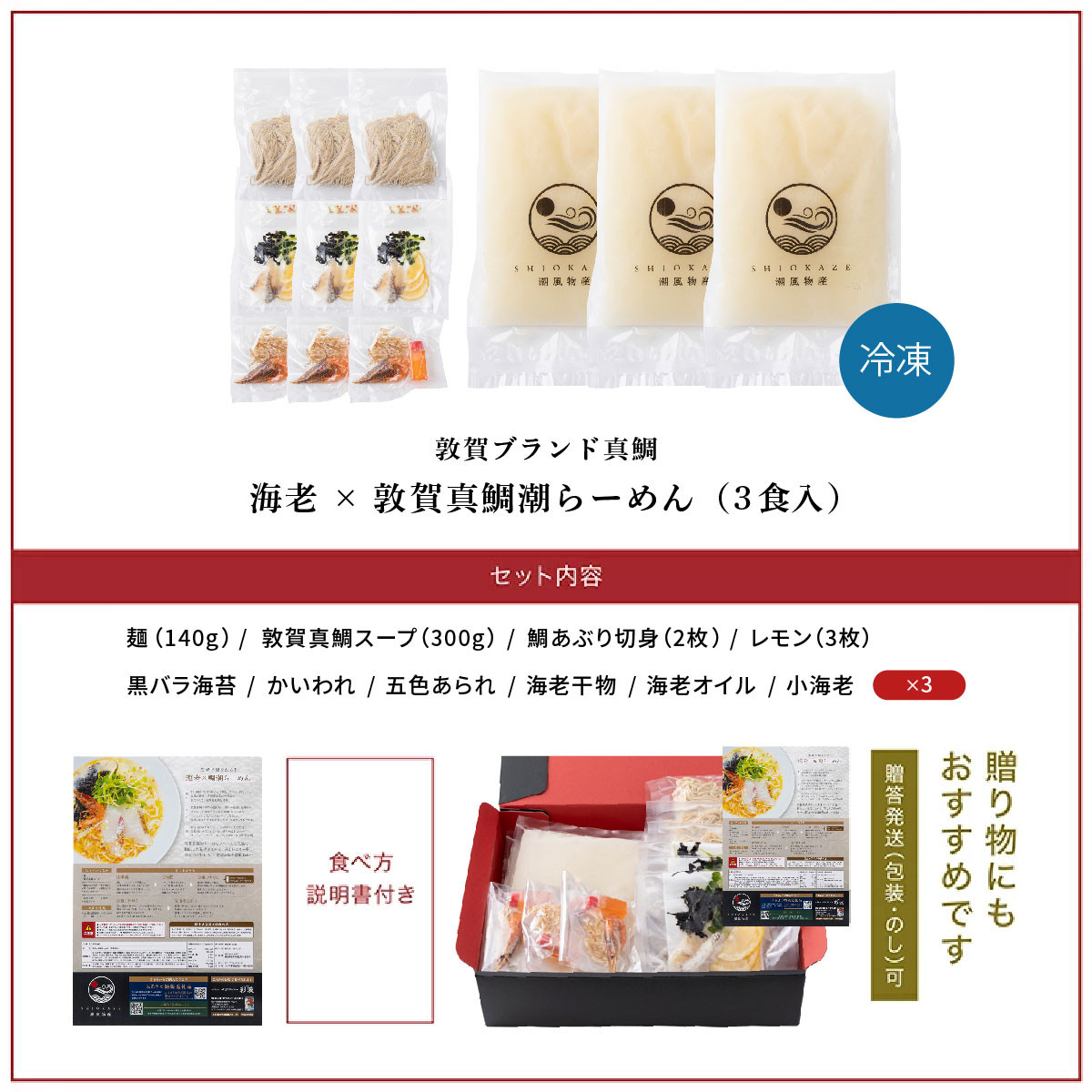 敦賀真鯛ラーメンをベースに低温抽出した海老オイルが冴えわたる!鯛と海老の旨味と風味が夢の共演!●冷凍麺×3●敦賀真鯛スープ×3●(鯛の切身2枚、レモン、黒バラ海苔、かいわれ、5色あられ、海老干物、海老オイル、小海老)×3