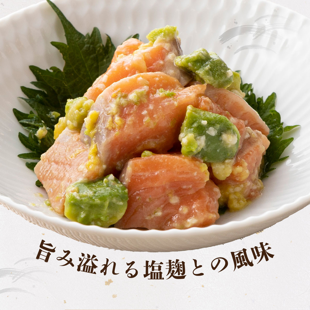 ふくいサーモン(国産)、アボカド、食塩 / 酸化防止剤(V.C)、pH調整剤)、米こうじ加工品(国内製造)、食塩、米発酵調味料、醸造酢、砂糖、魚醤、粉末酒粕、酵母エキス、味噌、寒天 / 増粘剤(加工デンプン、キサンタン)、調味料(有機酸)、甘味料(カンゾウ)、(一部に大豆を含む)