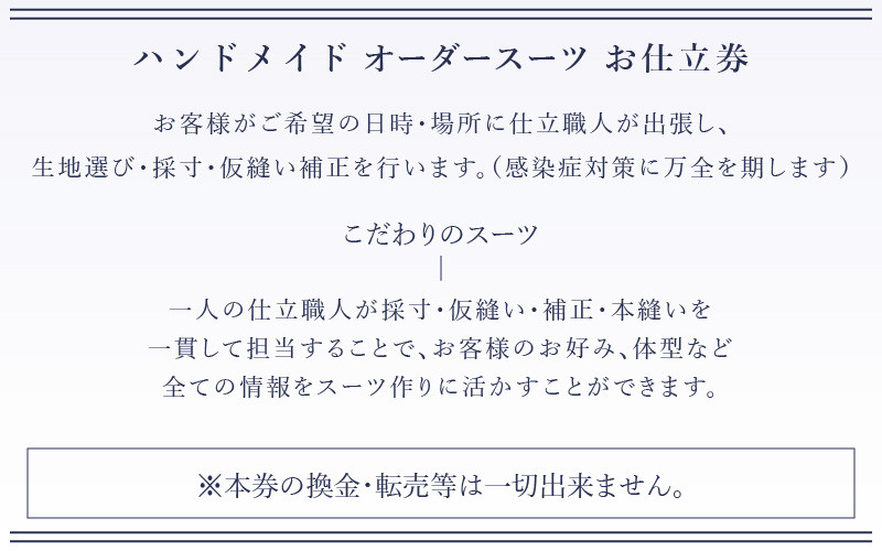 | 容量 | ■内容量 ハンドメイド オーダースーツ お仕立券 有効期限:お仕立券発行から1年 生地:ロイヤルファンファーレ(Royal Fanfare)または オブセッション(Obsession) |