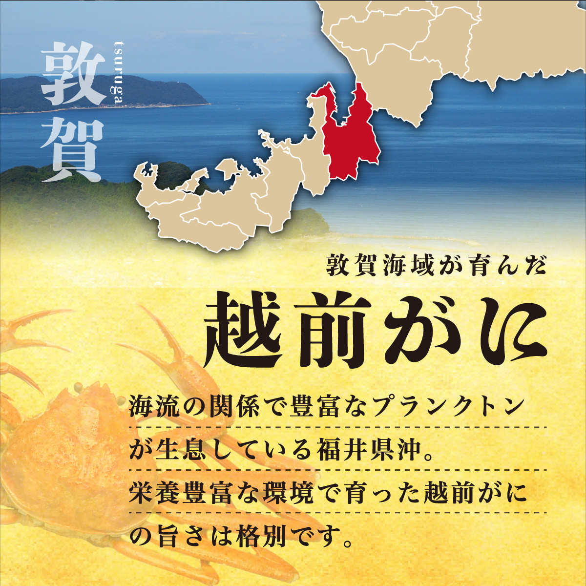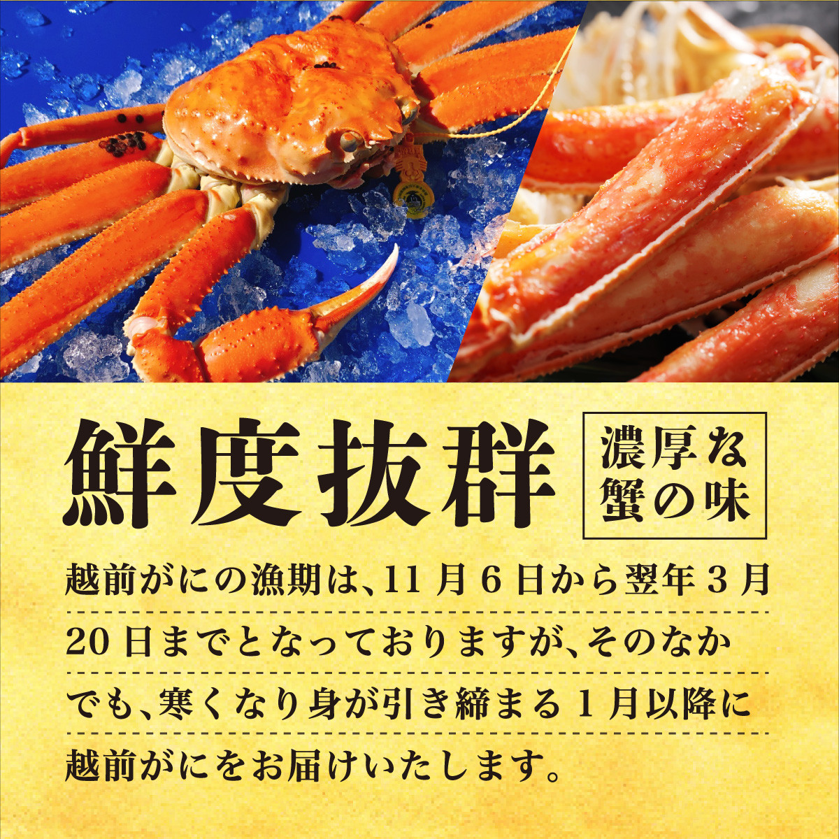 黄色いタグは、水産卸売市場に水揚げされた時に生きていること、脚が揃っていることなど厳しい基準をクリアしたブランド価値があることの証明であり、食べ応えがあり、かに味噌のコク、かにの身の旨みと甘みを存分にご堪能いただけます。