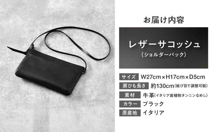 | 容量 | ■お礼品の内容について レザーサコッシュ×1 色:ブラック サイズ:W27×h17×d5(cm) 原産地:イタリア 製造地:小浜市 ■原材料 牛革 |