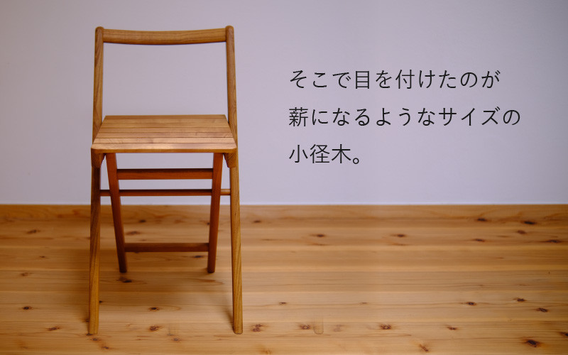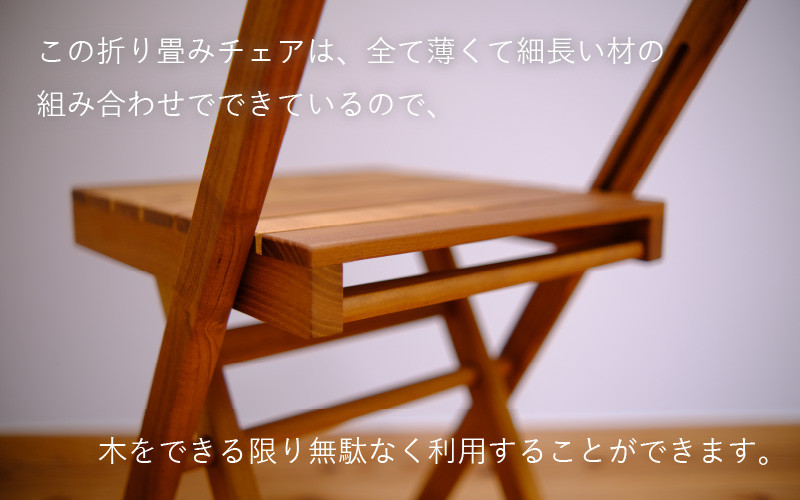 この折り畳みチェアは、全て薄くて細長い材の組み合わせでできているので、小さくても、多少割れが入っていても、材料となる部材を取り出すことができ、木をできる限り無駄なく利用することができます。