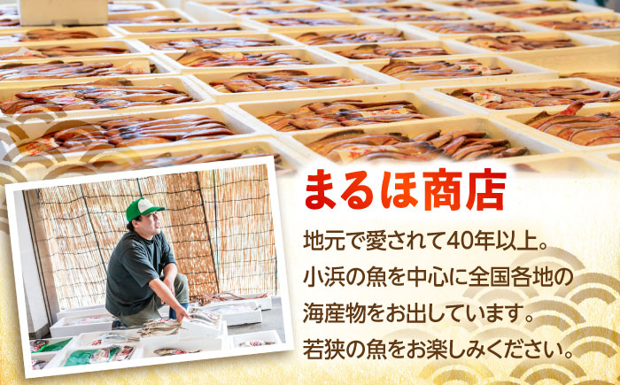 地元のお客さんや料理屋さんに、小浜の魚を中心に全国各地の海産物を販売しています。また、隣の県の滋賀県長浜へ焼鯖を販売している、鮮魚から加工品まで幅広い海産物を提供しています。前浜で直接小浜の魚を買い付けすることもできるので、鮮度抜群のお魚を提供できます。また、加工も行っていますので、干物、焼き物もお任せください。小さな加工場ですが、その分お客様のご要望に細かく応えることが出来ます。また、生魚も日々、加工しているからこそ、旬を見極めることが出来ます。漁師町といっても過言ではない小浜で、海の幸に関して、舌のこえた地元の皆様に「美味しかった」「まるほ商店で買ってよかった」「まるほ商店じゃないとだめ」といわれるよう日々、努力してまいりました。これからも、正直な商売を心がけて邁進してまいりたいです。