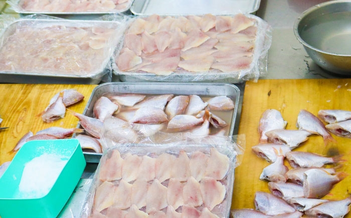 区域内外から原材料を調達し、区域内において職人が1枚1枚手作業で選別・骨とり・手切り・塩をふり、独自の味つけをおこない、包装までの一連の工程を行っています。(告示第5条第3号に該当)