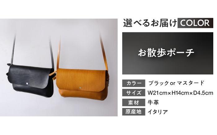 | 容量 | ■お礼品の内容について お散歩ポーチ×1 ※色をお選びください ・ブラック ・マスタード サイズ:w21×h12.5×d5(cm) 原産地:イタリア 製造地:小浜市 ■原材料 牛革 |