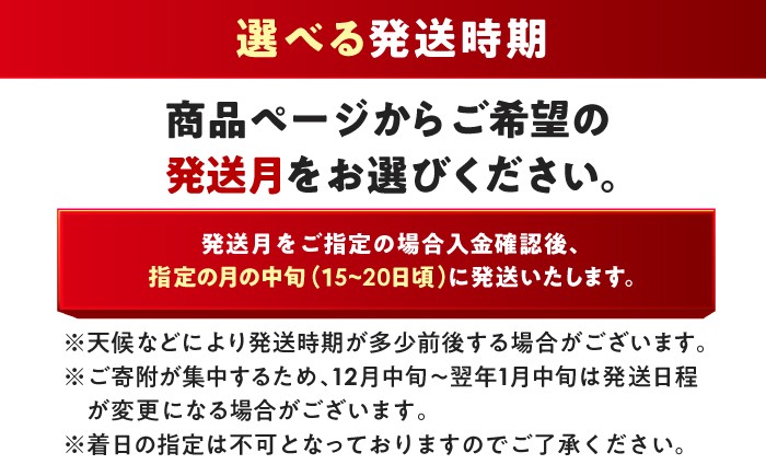 通常発送:入金確認後、約2週間で発送いたします。 発送月指定:指定月の中旬(15-20日頃)に発送いたします。 ※ご寄附が集中するため、12月中旬~翌年1月中旬は発送日程が変更になる場合がございます。 ※着日指定は、お受けできませんので予めご了承ください。 |