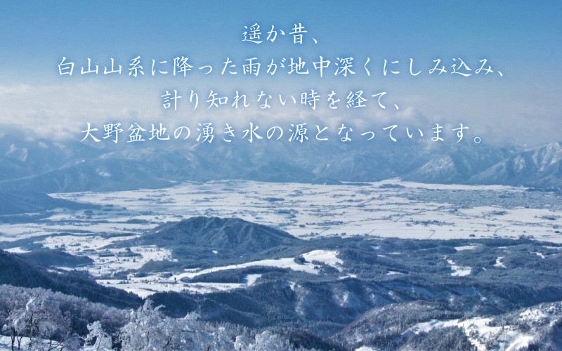 奥越前は福井県北東部に位置し、背後に白山水系を望む豪雪地帯です。神秘的な高峰の雪解け水は、いつしか清らかな流れとなって麓の町を潤していきます。遥か昔、白山山系に降った雨が地中深くにしみ込み、計り知れない時を経て、大野盆地の湧き水の源となっています。