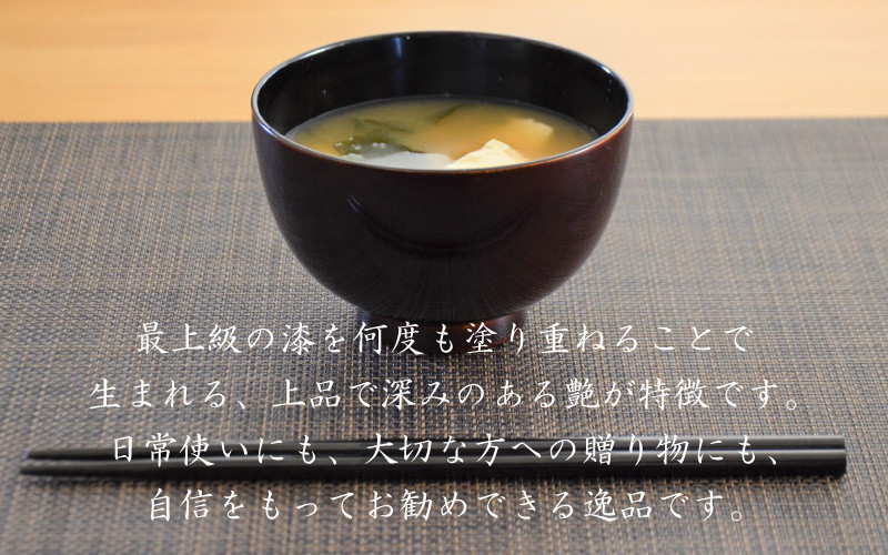 国産ケヤキの天然木を削り出し、ひとつひとつ手作業で丁寧に仕上げた至高の汁椀です。 熱いものを入れても器が熱くなりにくく、保温性にも優れています。 高級感のある器は、普段のお食事を素敵に演出してくれます。 笹島漆器工芸では、漆を塗る前の「木地」を製造しています。 全国的にも珍しい、原木から仕上げまでのすべての工程を自社で行う工房です。 令和3年の第71回越前漆器展覧会の素地部門で金賞を受賞しています。 この道45年の職人が熟練の技で削り出した、心地よく優しい手触りをご体感ください。 最上級の漆を何度も塗り重ねることで生まれる、上品で深みのある艶が特徴です。 日常使いにも、大切な方への贈り物にも、自信をもってお勧めできる逸品です。 ※画像はイメージです。 ※表示されている画像と実物とは多少色が異なる場合がございます。 ※食器洗浄機・乾燥機、電子レンジはご使用いただけません。 ※漆特有の香りがする場合があります。 ※化粧箱入りです。 事業者:笹島漆器工芸 [A-034002]