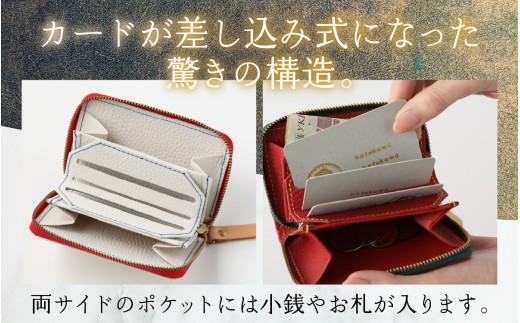 スロット型のカード入れ付き、手のひらサイズのラウンドファスナー財布です。