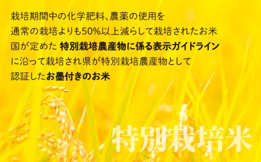 栽培期間中の化学肥料、農薬の使用を通常の栽培よりも50%以上減らして栽培されたお米で、国が定めた「特別栽培農産物に係る表示ガイドライン」に沿って栽培されており、県が特別栽培農産物として認証したお墨付きのお米です。化学肥料や農薬を減らすということは大変なことで通常よりも高い栽培技術と多くの手間と時間、そしてお金が必要となります。化学肥料に変えて油粕や魚粉、鶏糞などの有機物を原料にした有機肥料を利用したり、農薬を減らすために田んぼに入り手で草を取ったりと、お米に寄り添い、子どもを育てるように愛情を注ぎ込むからこそ、美味しく、品質も高く安全なお米が育つことになります。