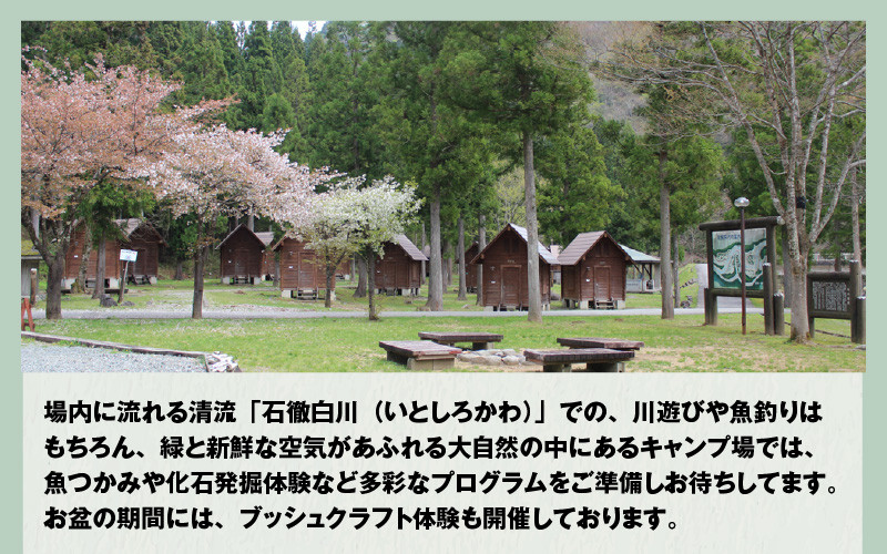 場内に流れる清流「石徹白川(いとしろかわ)」での、川遊びや魚釣りはもちろん、緑と新鮮な空気があふれる大自然の中にあるキャンプ場では、魚つかみや化石発掘体験など多彩なプログラムをご準備しお待ちしてます。