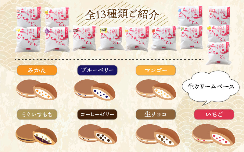 地元で愛される老舗和菓子店の看板商品「生どら」。全13種の豪華詰め合わせ。 ひろせの生どら(生クリームどら焼)バラエティセット 13個入り 【お歳暮】