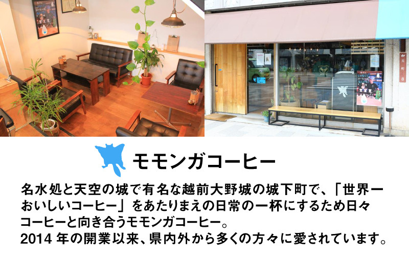 自家焙煎店ならではの特別なドリップバッグ。上質なコーヒー豆を現地まで買い付けに行くほどこだわり、店主自ら焙煎したオリジナルブレンドとストレートコーヒー。名水処と天空の城で有名な越前大野城の城下町で、「世界一おいしいコーヒー」をあたりまえの日常の一杯にするため日々コーヒーと向き合うモモンガコーヒー。2014年の開業以来、県内外から多くの方々に愛されています。 ※画像はイメージです。 事業者:モモンガコーヒー [A-032001]