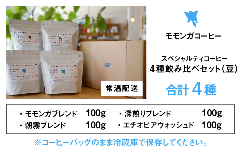 オリジナルブレンド3種と、個性的な味わいのシングルオリジン1種の飲み比べセット モモンガコーヒーのスペシャルティコーヒー4種飲み比べセット(豆)【2月3日~2月15日発送不可】