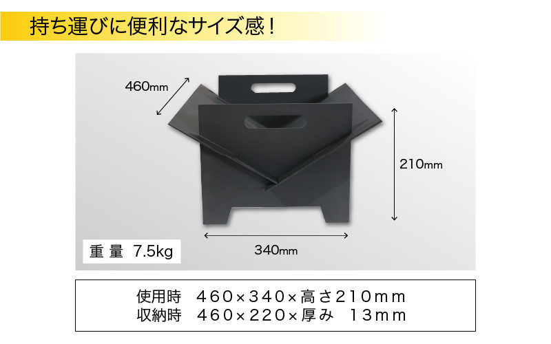 | 容量 | アウトドア用品 アイアン焚き火台 【サイズ】 使用時:460 × 340 × 高さ210mm 収納時:460 × 220 × 厚み13mm 重 量:7.5kg 【原材料】 鉄 |