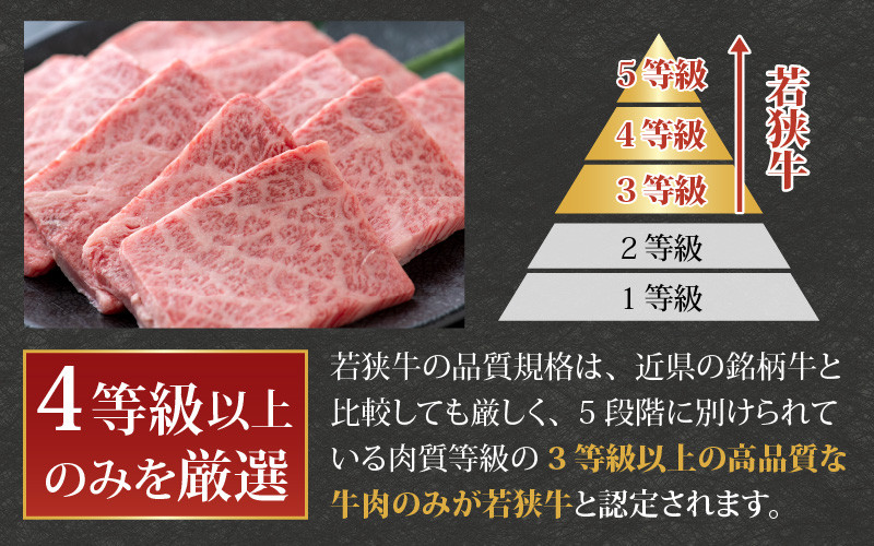 若狭牛の品質規格は、近県の銘柄牛と比較しても厳しく、5段階に別けられている肉質等級の3等級以上の高品質な牛肉のみが若狭牛として販売されています。