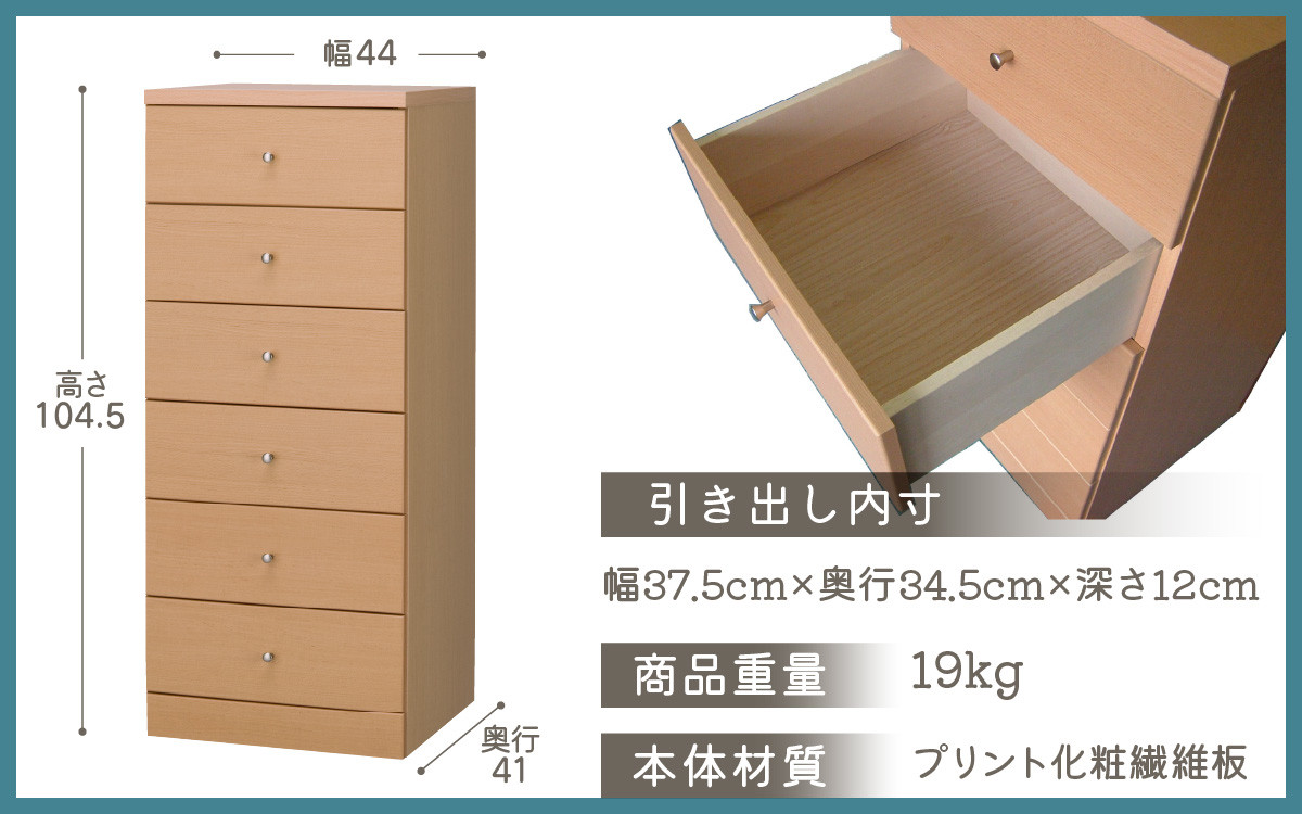 | 容量 | スリム多段チェスト 6段 完成品 1台 商品サイズ 幅44cm×奥行41cm×高さ104.5cm 引き出し内寸 幅37.5cm×奥行34.5cm×深さ12cm 商品重量 19kg 本体材質 プリント化粧繊維板 ※完成品をお届けします(取っ手のみお客様ご自身で取り付けをお願いいたします) サイズ違い(5段タイプ、7段タイプ)もご用意しております |