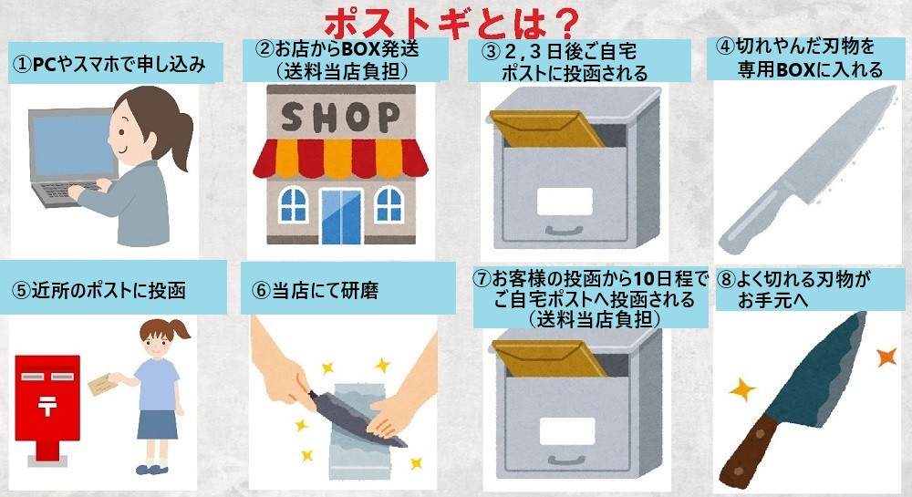 ポストに投函するだけで、10日前後でキレイで良く切れる刃物がお手元に届けられます。