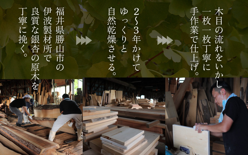 福井県勝山市の製材所で良質な銀杏原木(丸太)を丁寧に挽き、2~3年天然環境でゆっくり自然乾燥させます。
