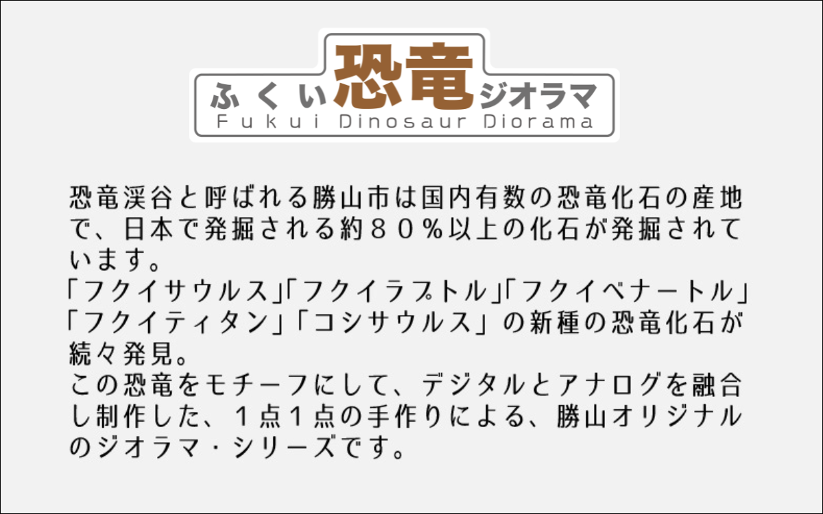この勝山産の恐竜達を、デジタルとアナログを融合した、1点1点の手作り制作による、勝山産のジオラマ模型です。