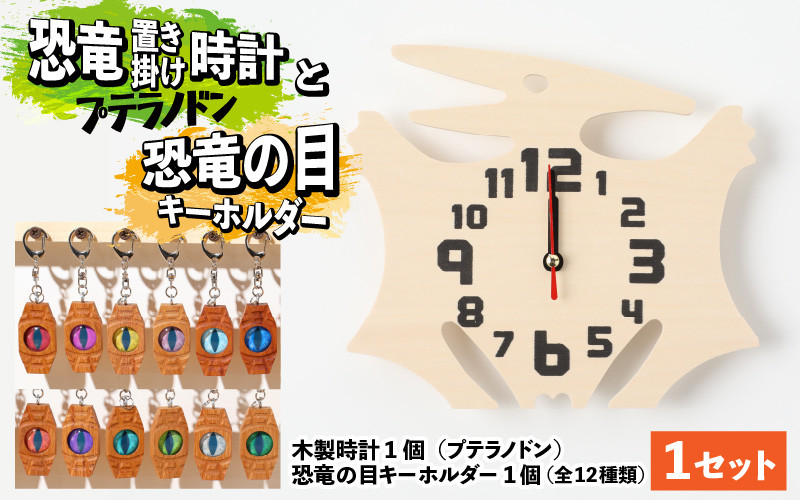 12種類の木製恐竜置き掛け時計。恐竜の目キーホルダー付き。 木製恐竜置き掛け時計(プテラノドン)と恐竜の目キーホルダー(全12色)[A-055005]