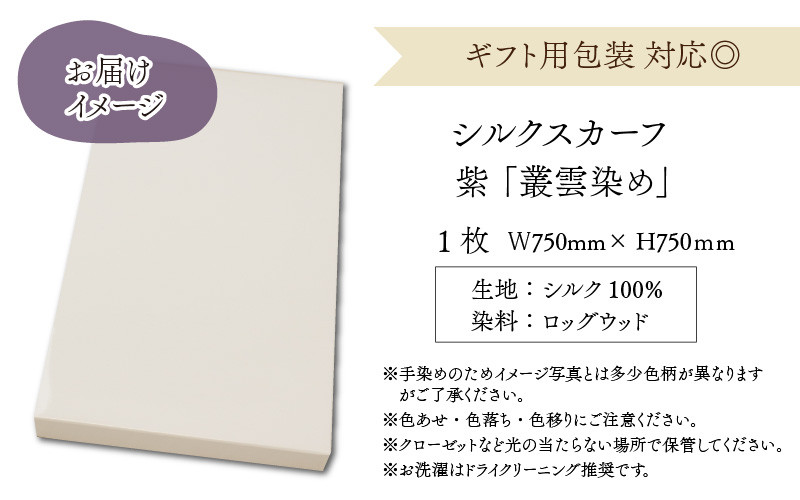 | 容量 | ■内容量 シルクスカーフ 紫(ロッグウッド)叢雲染め 約750mm×750mm 1枚 ■原材料 生地:シルク100% 染料:ロッグウッド |