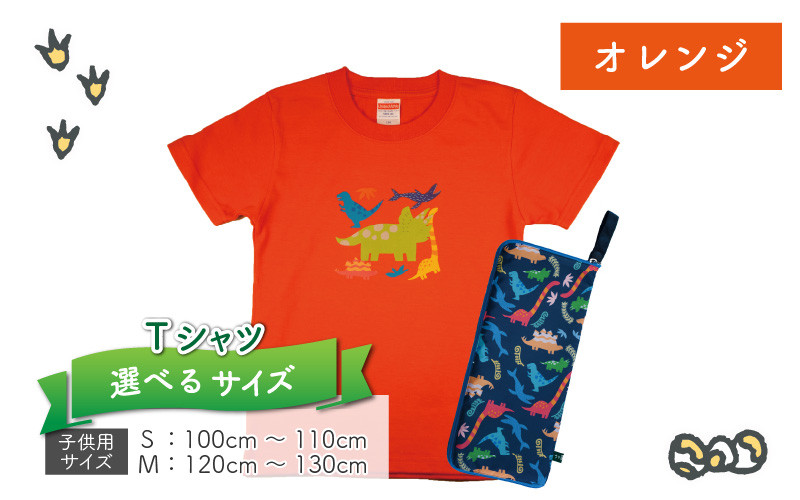 可愛い恐竜プリントを施したちゃまりゅうブランドのTシャツと防水マルチケースです キッズTシャツ(オレンジ・トリケラ大柄 / S)と防水ケース(黒×カラフル)の2点セット[A-003039_01_01]