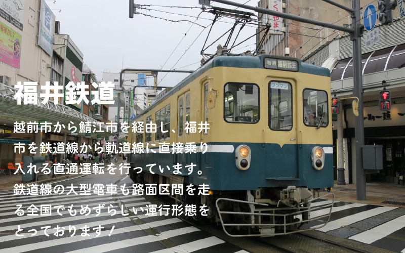 越前市から鯖江市を経由し、福井市を鉄道線から軌道線に直接乗り入れる直通運転を行っています。鉄道線の大型電車も路面区間を走る全国でもめずらしい運行形態をとっております!