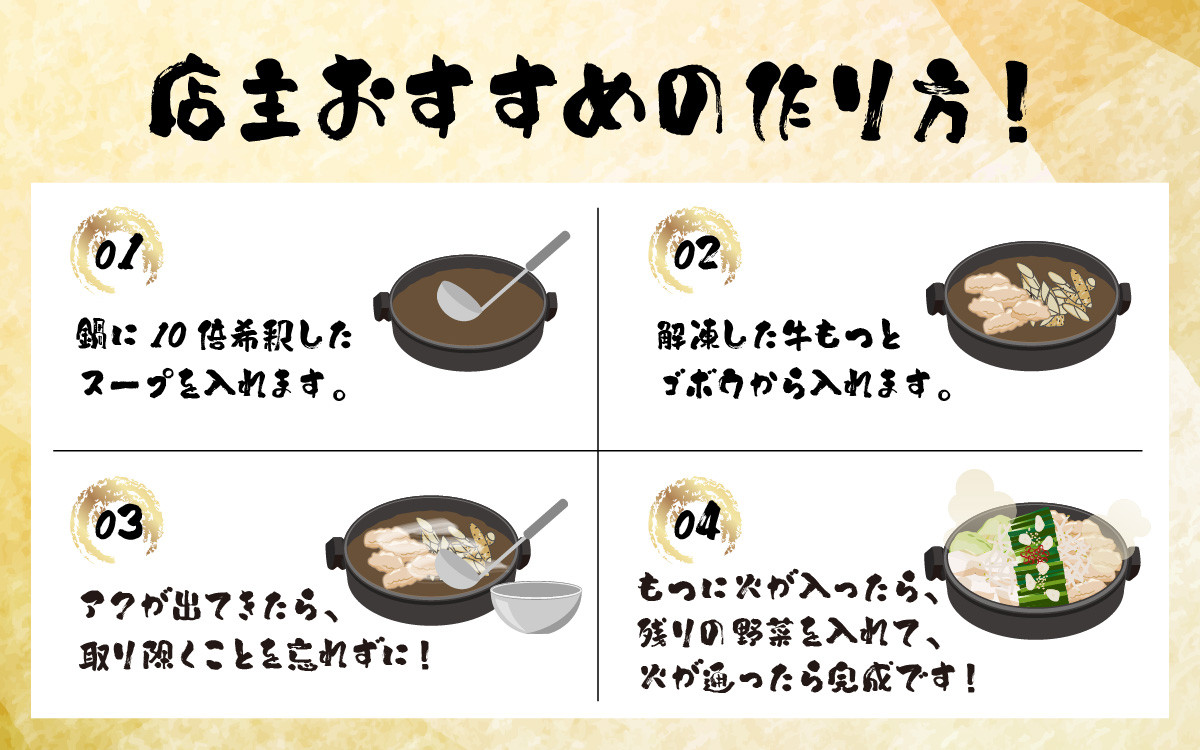 熟練の技で下処理を施した牛もつ、大豆醬油に魚介だしをブレンドしたこだわりスープ 焼肉店主がこだわり抜いて仕上げた、牛もつ鍋(濃縮魚介スープ付)×1セット(2人前) [A-082002]