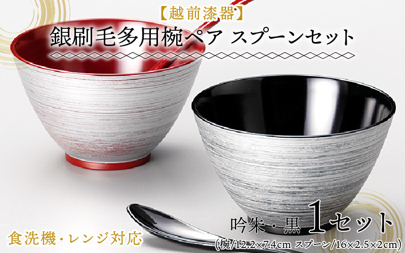シックな銀と高級感のある色彩。食洗機・レンジ対応で、使い勝手の良いペア多用椀。 銀刷毛(ぎんはけ)多用椀ペア スプーンセット 吟朱・黒 食洗機・レンジ対応 [B-08412] / 漆塗 日本製 食洗機対応 電子レンジ対応 ギフト