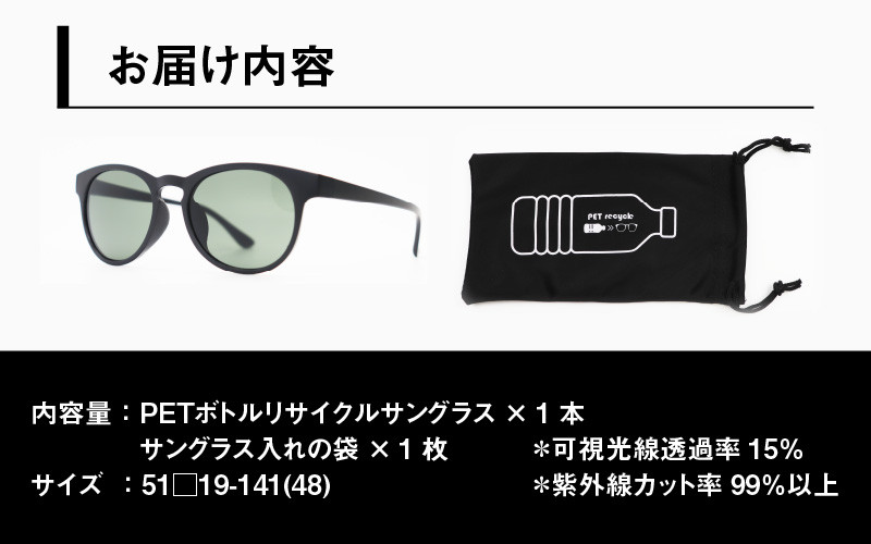 | 容量 | 【内容】 PETボトルリサイクルサングラス × 1本 (レンズの色:緑色) サングラス入れの袋 × 1枚 【サイズ】 51□19-141 ↑↓48 【材質】 フレーム:リサイクルPET樹脂 レンズ:プラスチック 可視光線透過率:15% 紫外線カット率:99%以上 |