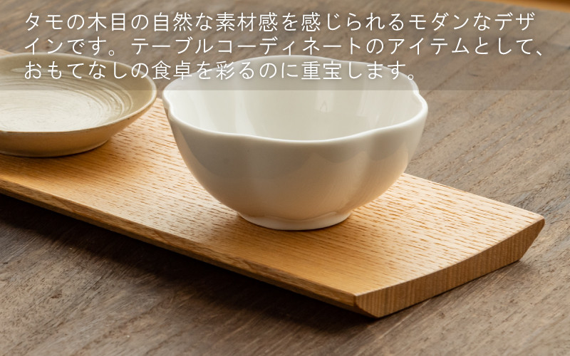 丈夫で美しい風合いのタモ材を使用した盛り皿は、お洒落なデザインで食卓を彩るのに一役買ってくれます。